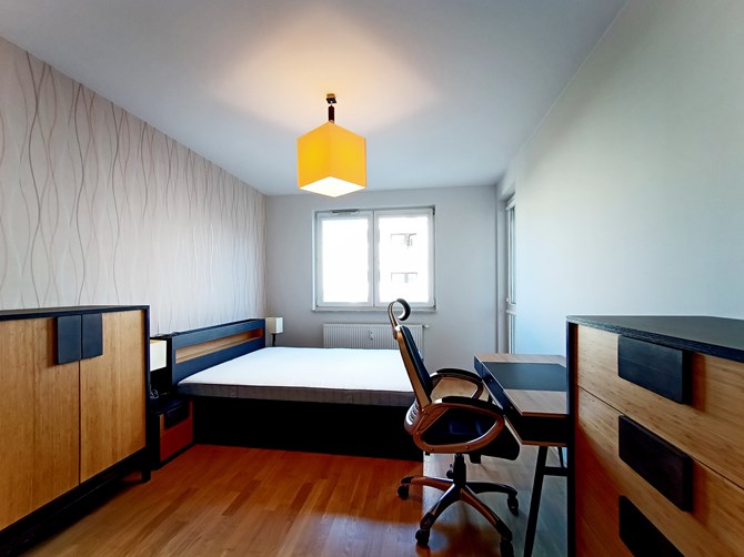 Pokój: podwójne łóżko z materacem, 2 szafki nocne, 2 komody, szafa, biurko, krzesło.