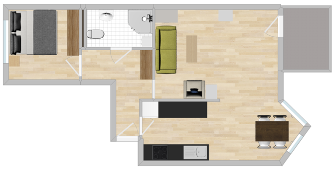 *Duży salon połączony z kuchnią, balkon, spora sypialnia, hall, łazienka.