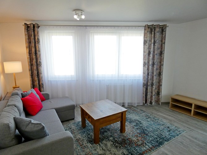 Salon z balkonem: narożnik rozkładany, stolik, szafka RTV.