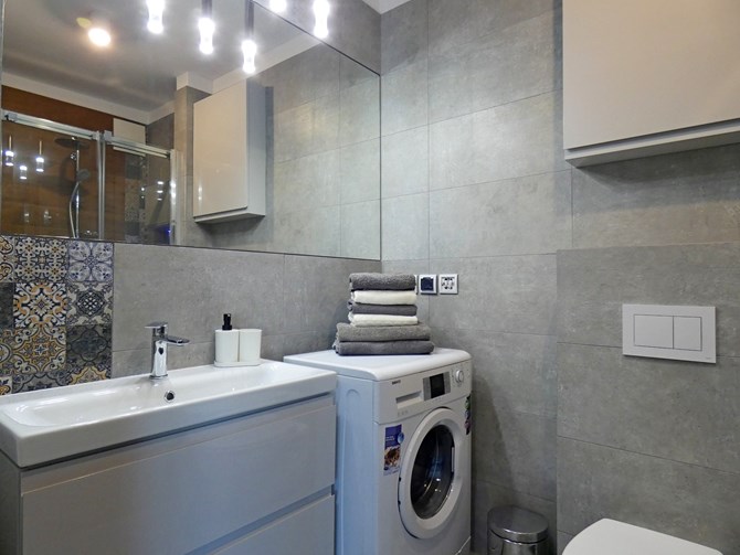 Łazienka: kabina prysznicowa, umywalka, pralka, WC, szafki.