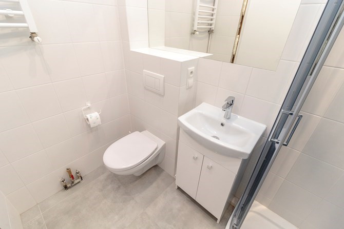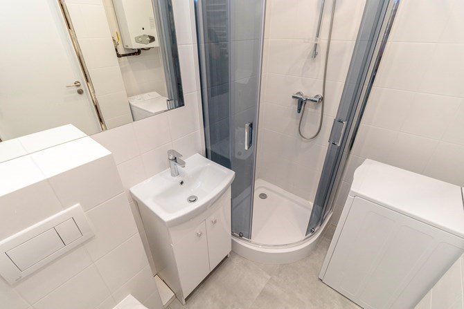 Łazienka: kabina prysznicowa, pralka, umywalka z szafką, lustro, WC.