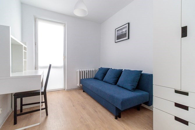 Sypialnia: rozkładana kanapa, biurko, krzesło.