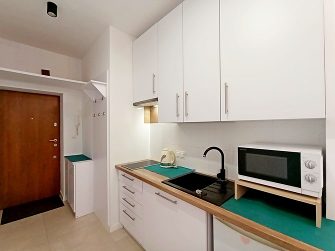 Kuchnia: lodówka, okap, 2-palnikowa płyta elektryczna, mikrofalówka, zlewozmywak.