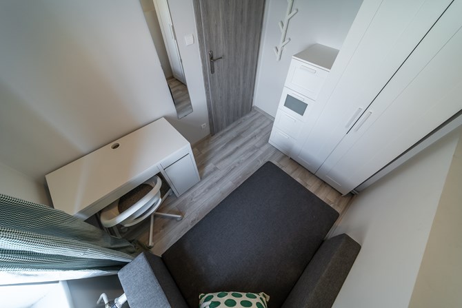 Pokój: łóżko 1- osobowe, biurko z krzesłem, szafa, półki