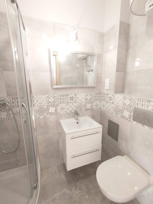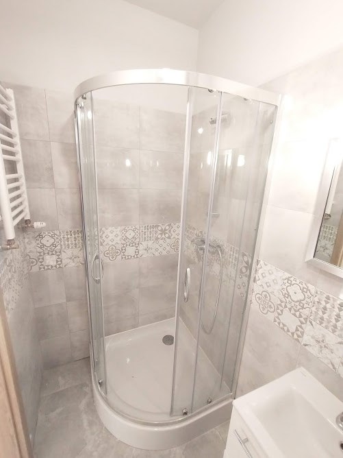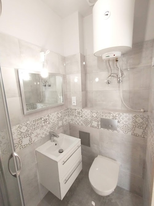 Łazienka razem z WC: lustro, szafki, umywalka, prysznic, bojler.