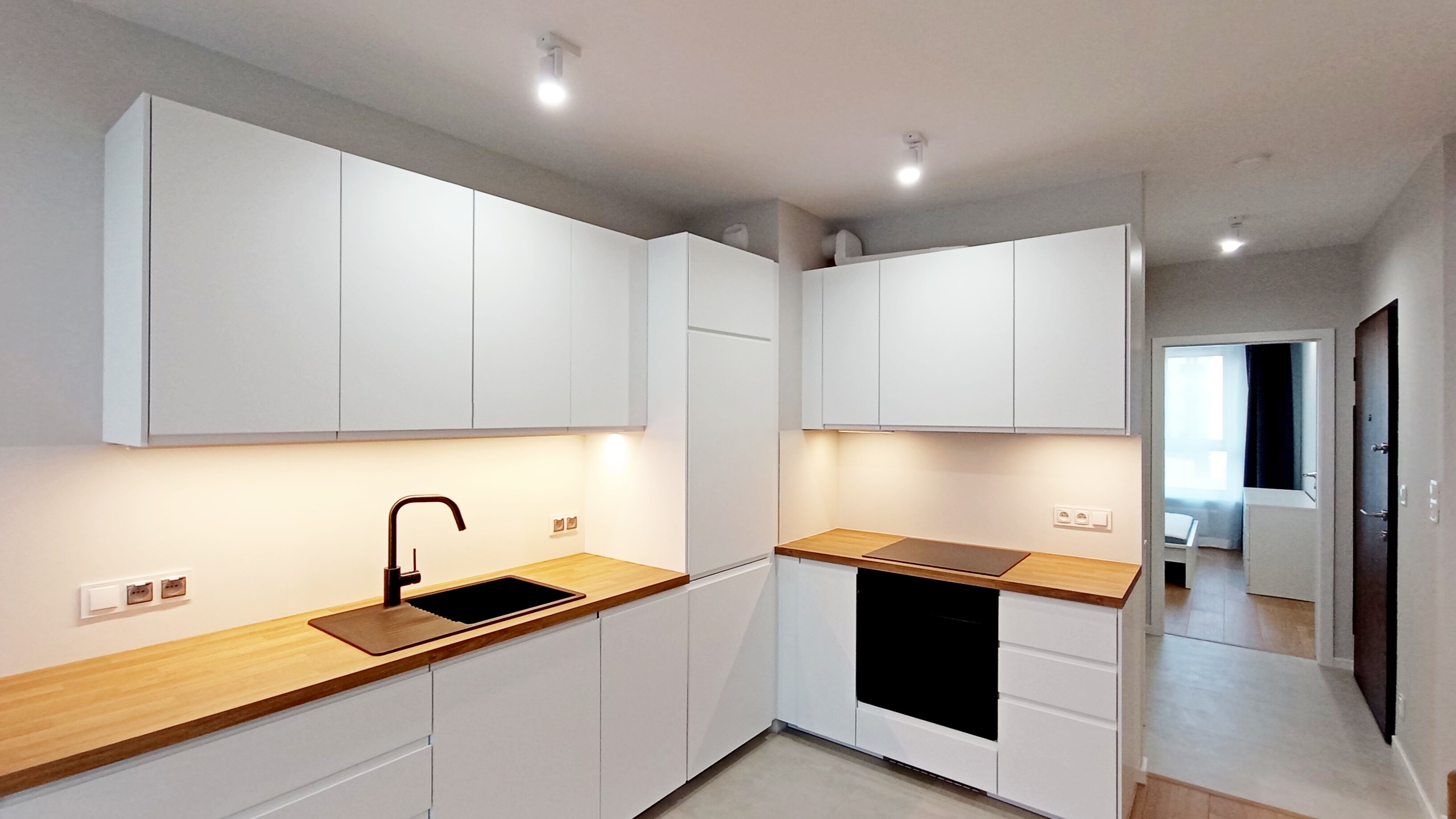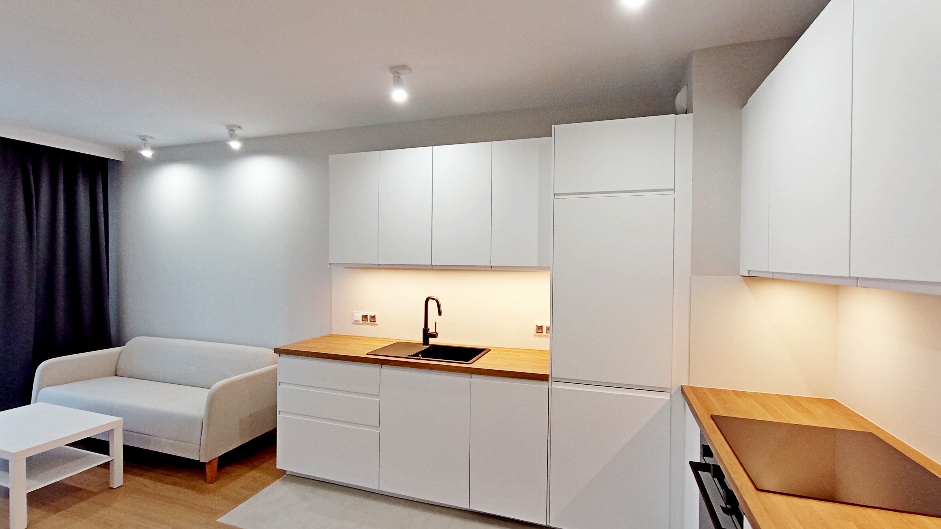 Kuchnia: lodówko-zamrażarka, okap, 4-palnikowa płyta indukcyjna, zmywarka, piekarnik, zlewozmywak.