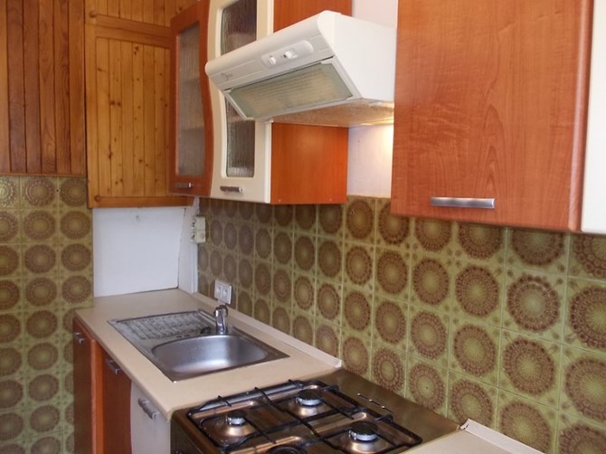 Kuchnia: szafki , stół z krzesłami, lodówka, kuchenka z piekarnikiem.
