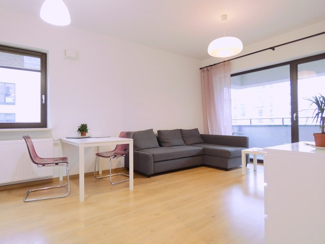Do wynajęcia dwupokojowe mieszkanie z balkonem i miejscem postojowym w nowoczesnym budynku z ochroną, położone przy ul. J.R.R Tolkiena 1, w biznesowej części warszawskiego Mokotowa.