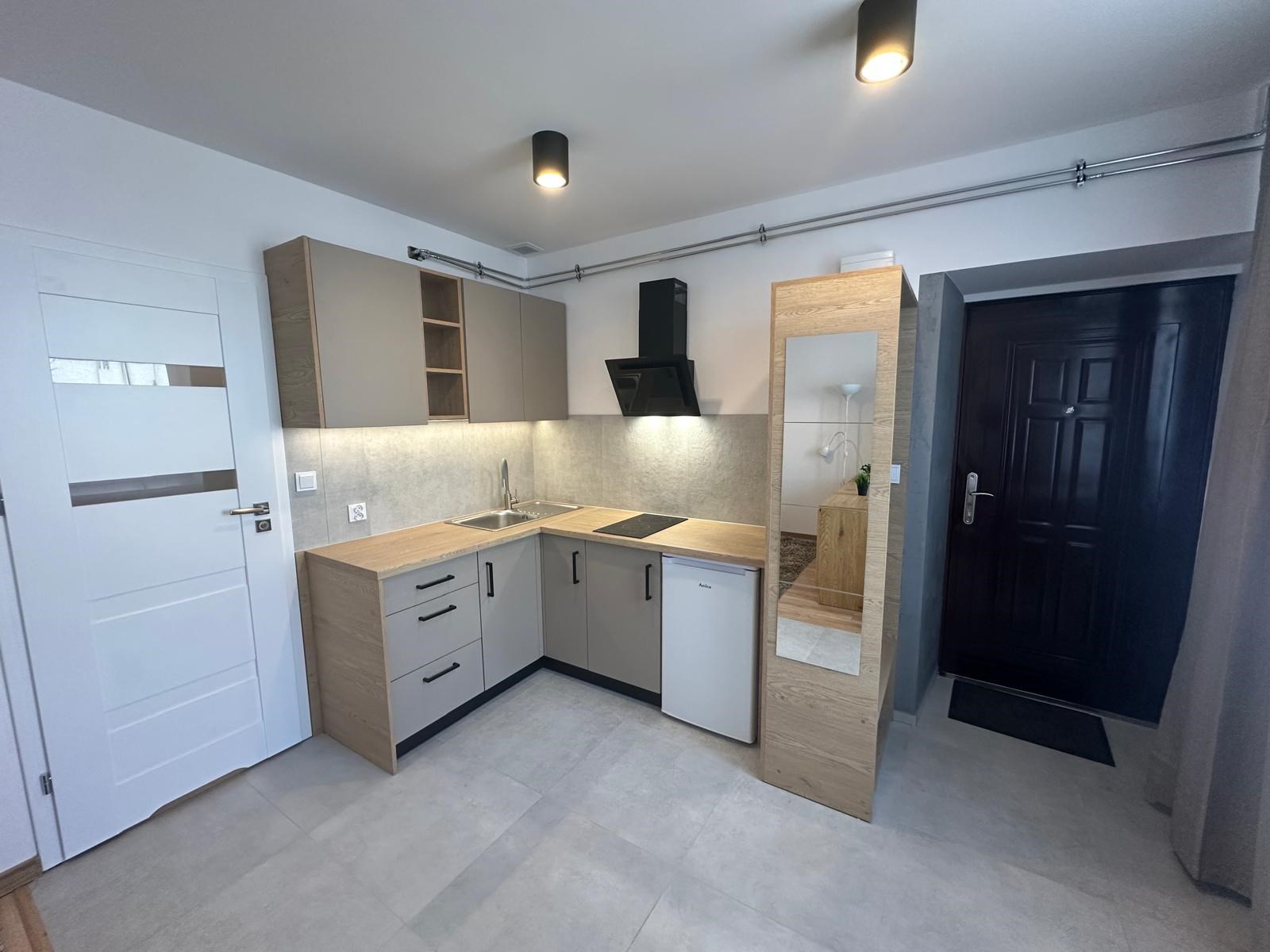 Kuchnia: lodówko-zamrażarka, okap, 2-palnikowa płyta elektryczna, zlewozmywak.