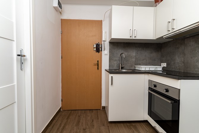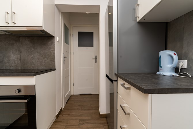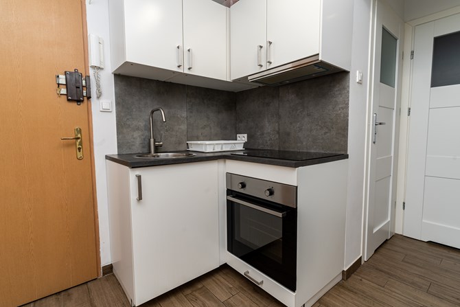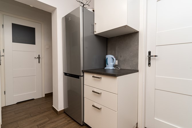 Kuchnia: zabudowa górna i dolna, piekarnik, płyta indukcyjna 4-polowa, okap, zlew jednokomorowy, lodówka, czajnik.
