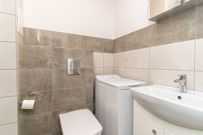 Łazienka: kabina prysznicowa, WC, umywalka, szafka, pralka, szafka z lustrem i oświetleniem.