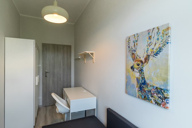 Pokój: łóżko 1- osobowe, biurko z krzesłem, szafa, półki.
