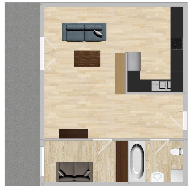 *Salon: rozkładana sofa, szafka RTV, stolik, stół + 2 krzesła.