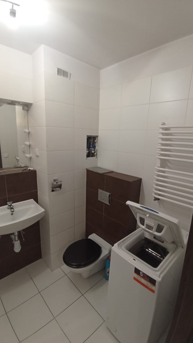Łazienka: kabina prysznicowa, umywalka i pralka, WC.