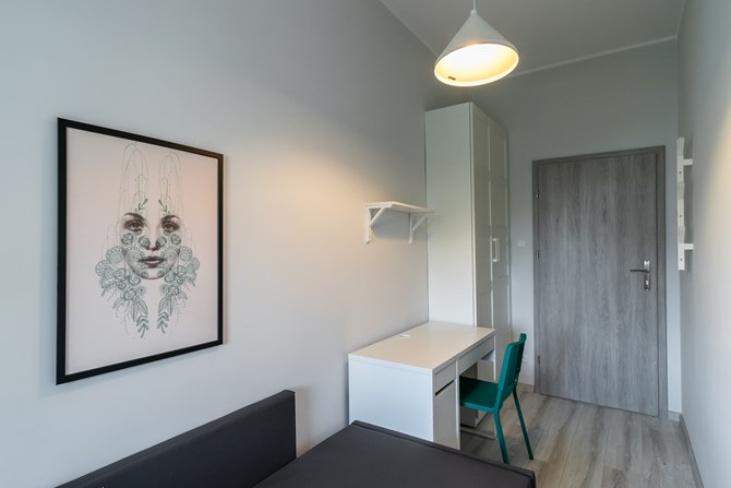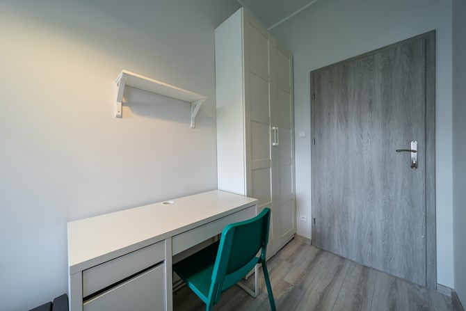 Pokój: łóżko jednoosobowe, biurko z krzesłem, szafa, półki.