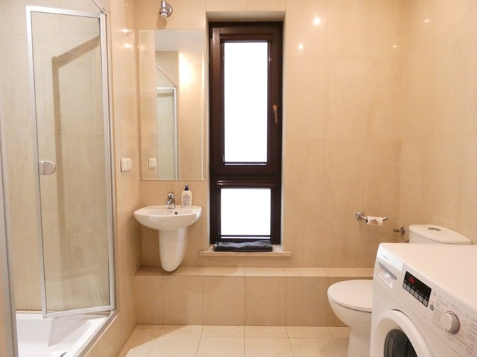 Łazienka 1: WC, umywalka, lustro, prysznic, pralka.
