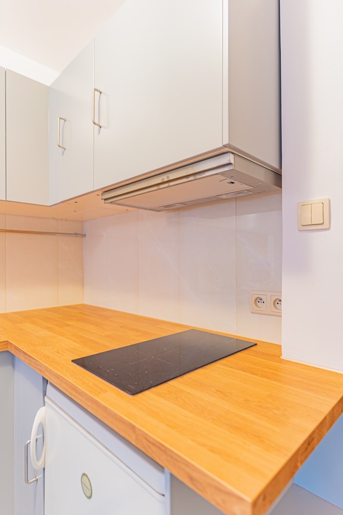 Kuchnia: zabudowa górna i dolna, pralka, okap, mikrofalówka, lodówka, kuchenka elektryczna dwupalnikowa, zlew jednokomorowy;
