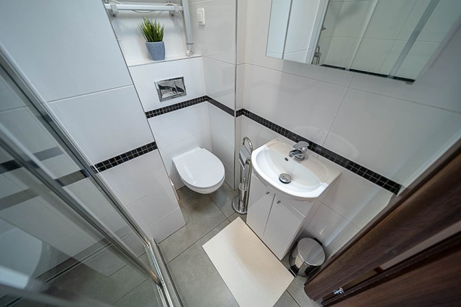 Łazienka: prysznic, umywalka, suszarka elektryczna na ręczniki, WC.