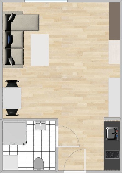 Kuchnia: szafki wiszące i stojące, lodówka, dwupalnikowa płyta indukcyjna, mikrofalówka, zlewozmywak.