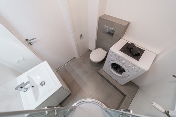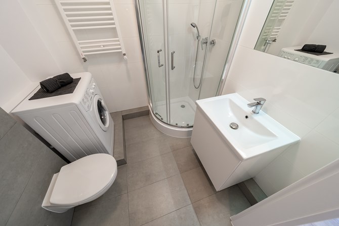 Łazienka razem z WC: lustro, kabina prysznicowa, pralka, szafka.