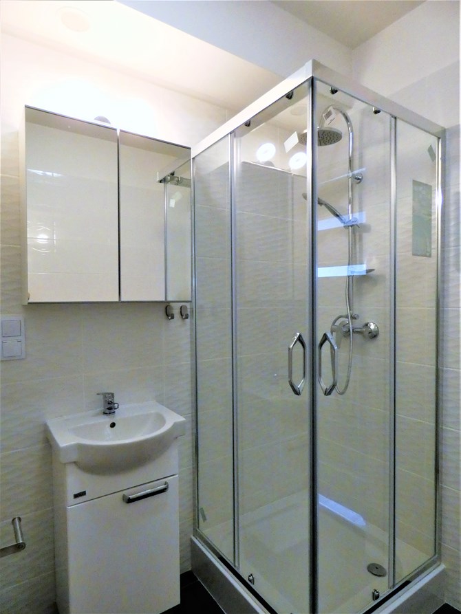 Łazienka: kabina prysznicowa, toaleta, umywalka, pralka, szafki.