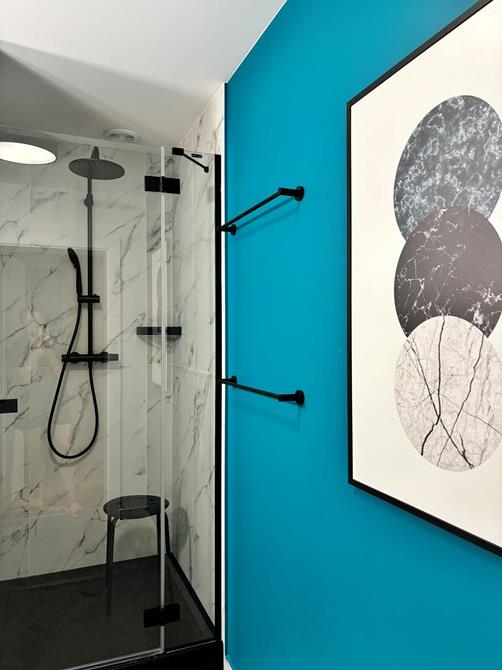 Łazienka: kabina prysznicowa, pralka, szafka, umywalka, lustro.
