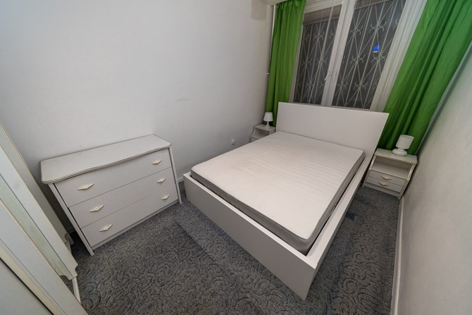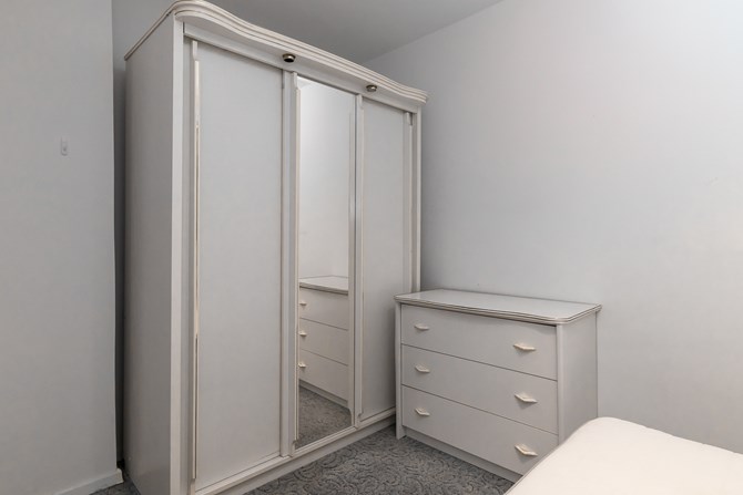 Sypialnia: łóżko, stoliki nocne, komoda, szafa.