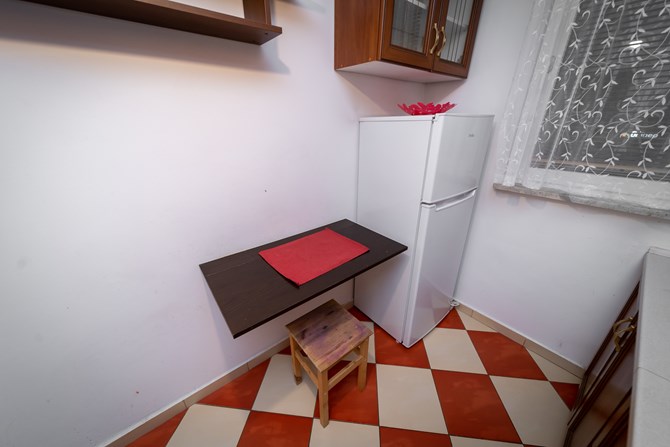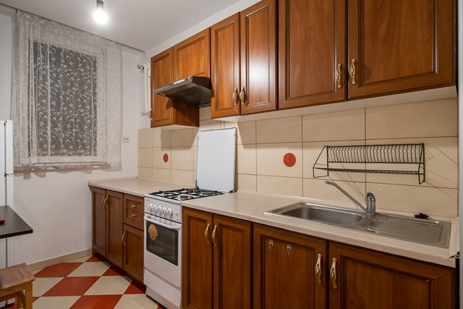 Kuchnia: meble kuchenne, lodówka, kuchenka gazowa + piekarnik, okap, zlew.