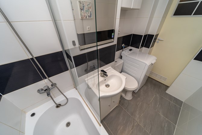 Łazienka: wanna z funkcją prysznica, umywalka, WC, pralka.