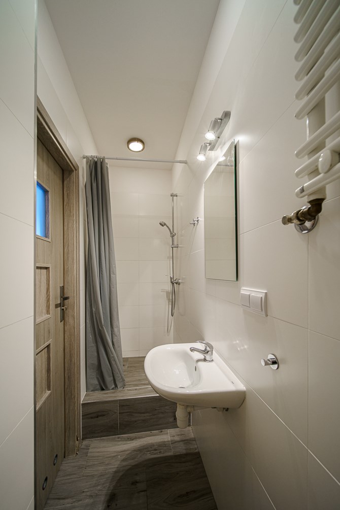 Łazienka: prysznic, wc, umywalka oraz szafka w zabudowie.