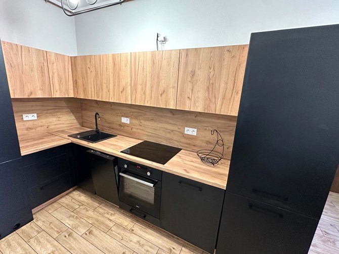 Kuchnia: szafki wiszące i stojące, płyta indukcyjna, piekarnik, lodówka, zamrażarka, pralko-suszarka, piec gazowy dwufunkcyjny.