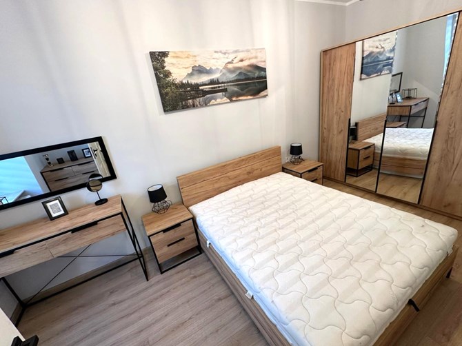 Sypialnia: łóżko, szafki nocne, szafa, komoda, toaletka.