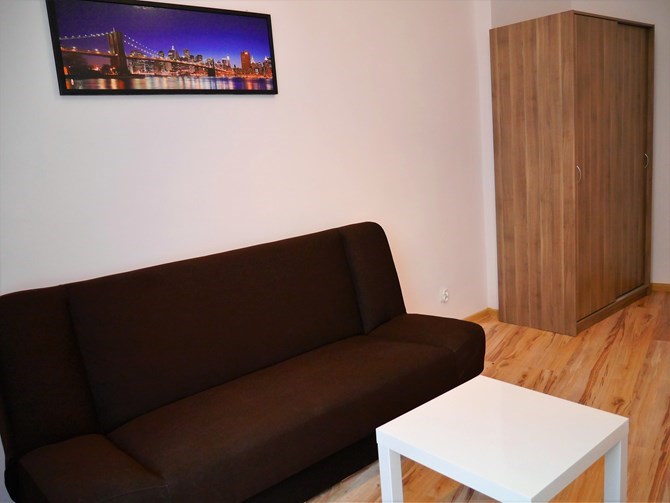 Pokój: wygodna 1- osobowa kanapa, biurko z krzesłem, szafa oraz regał.