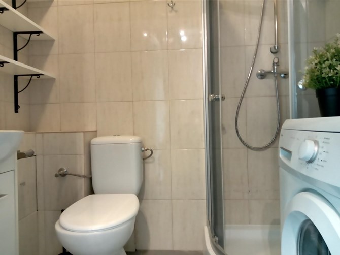 Łazienka z WC: umywalka, pralka, prysznic, półki, szafki.