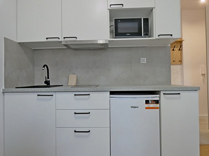 Kuchnia: lodówko-zamrażarka, okap, 2-palnikowa płyta indukcyjna, mikrofalówka, zlew.