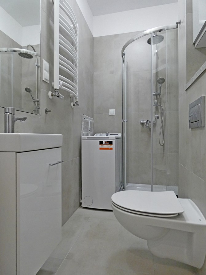 Łazienka: prysznic, pralka, WC, umywalka.