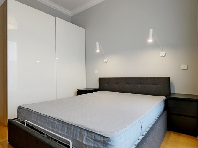 Sypialnia: podwójne łóżko z materacem, 2 x szafka nocna, szafa.