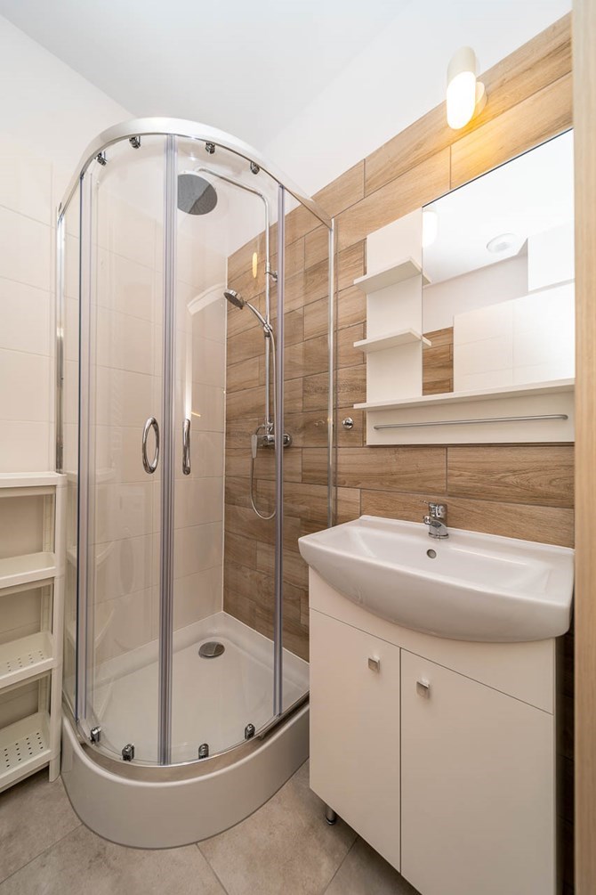 Łazienka razem z WC: lustro z półką, kabina prysznicowa, pralka, regał.