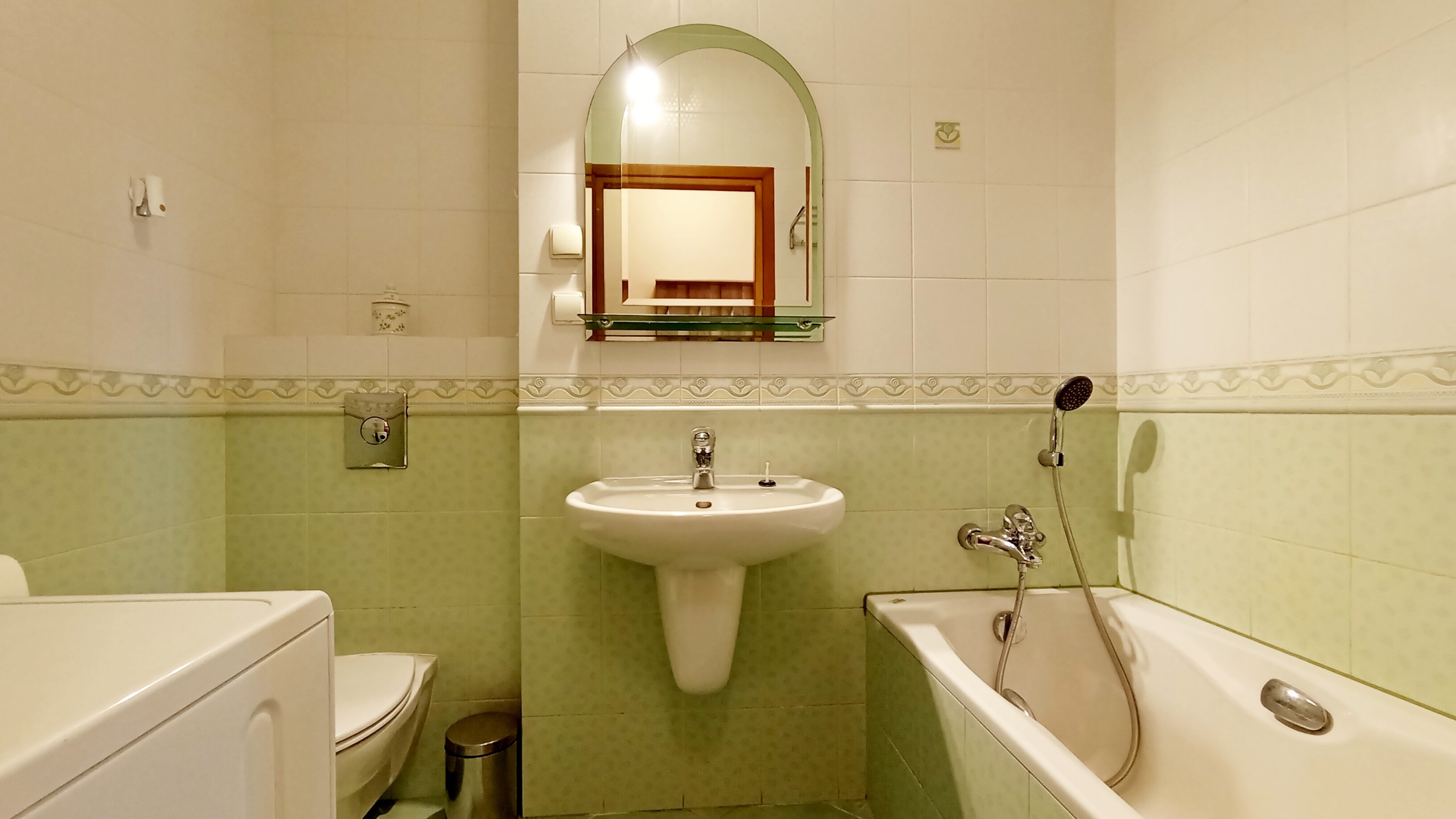 Łazienka: pralka, wanna, WC, umywalka.