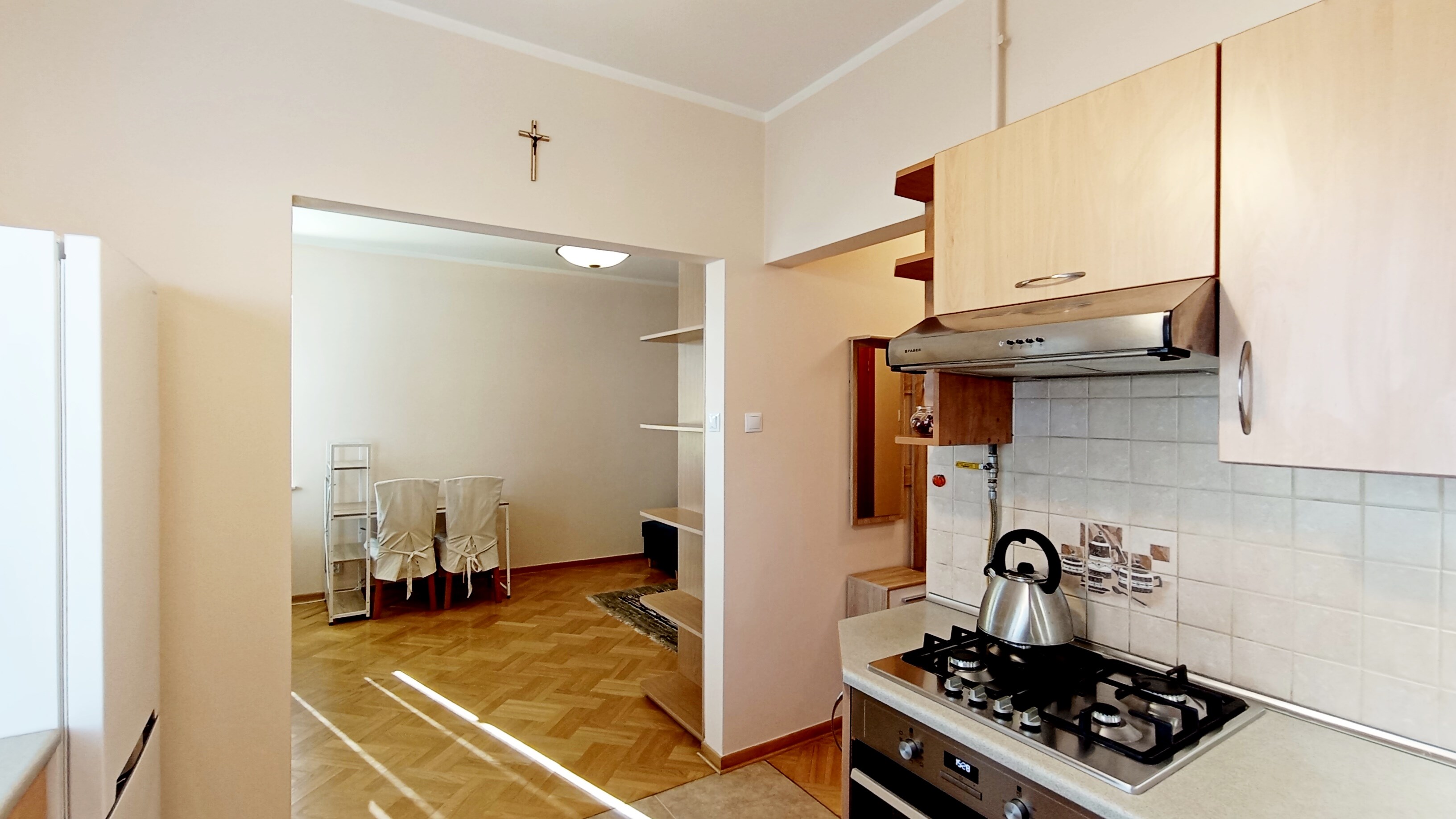 Kuchnia: lodówko-zamrażarka, zmywarka, okap, 4-palnikowa płyta gazowa, piekarnik, zlewozmywak.