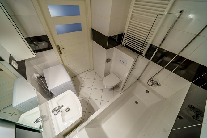 Łazienka: pralka, wanna, szafka wisząca, umywalka z szafką.