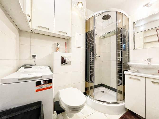 Łazienka: prysznic, WC, umywalka, szafka pod umywalką, szafka podwójna, szafka wisząca, pralka.