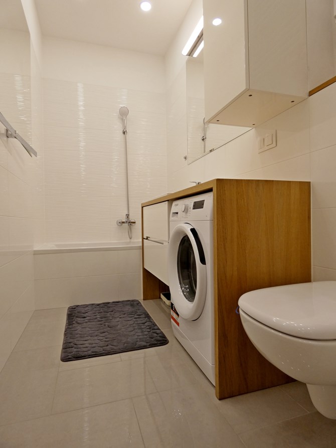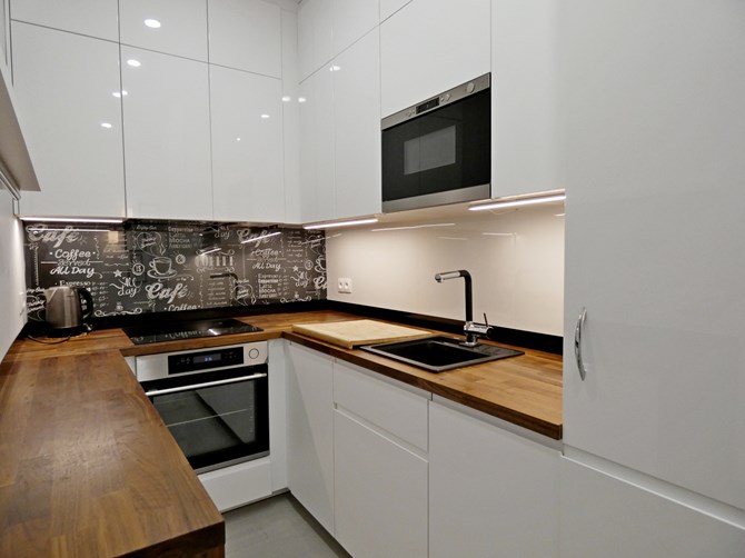 Kuchnia: lodówko-zamrażarka, piekarnik, okap, 4-palnikowa płyta indukcyjna, zmywarka, mikrofalówka, czajnik elektryczny, zlewozmywak.