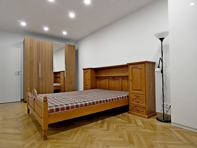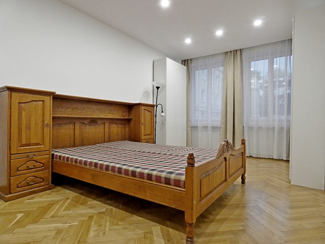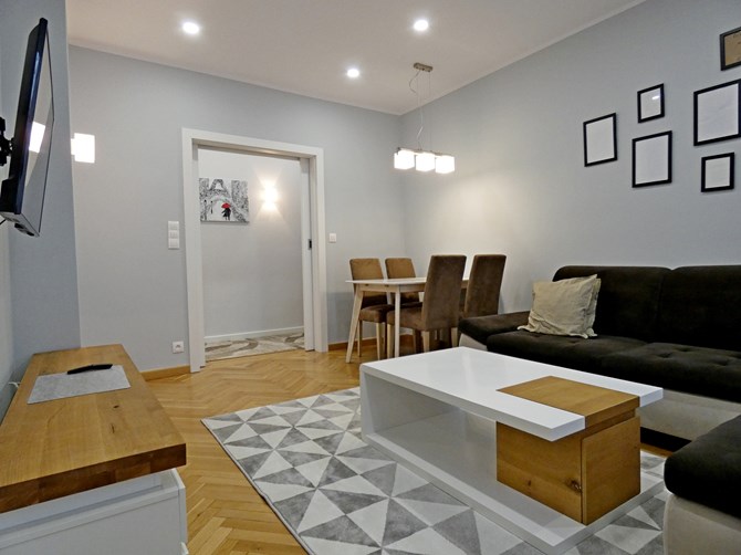 Składa się z przestronnego salonu, sypialni, pokoju, oddzielnej kuchni oraz łazienki z wanną.
