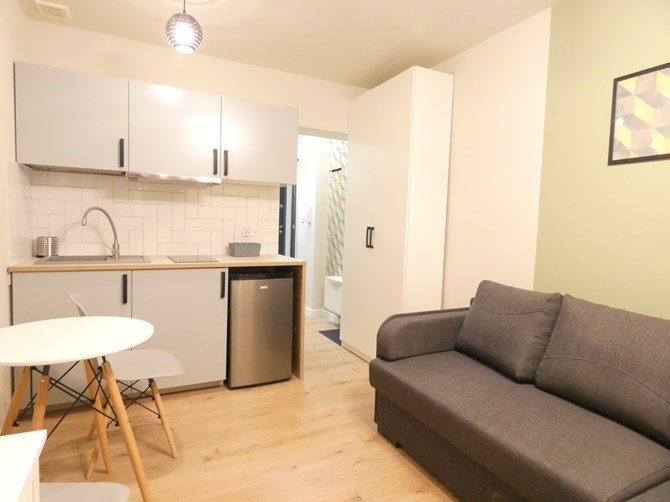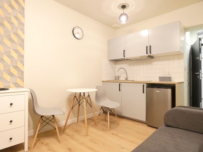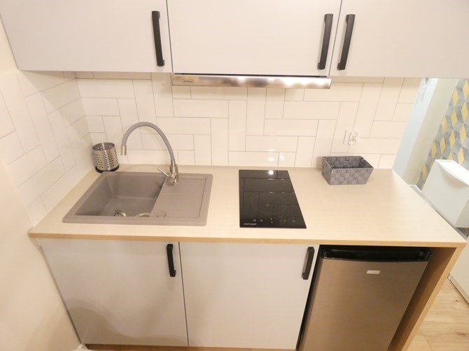 Kuchnia: lodówka, 2-palnikowa płyta indukcyjna, okap, zlew, szafki stojące i wiszące.