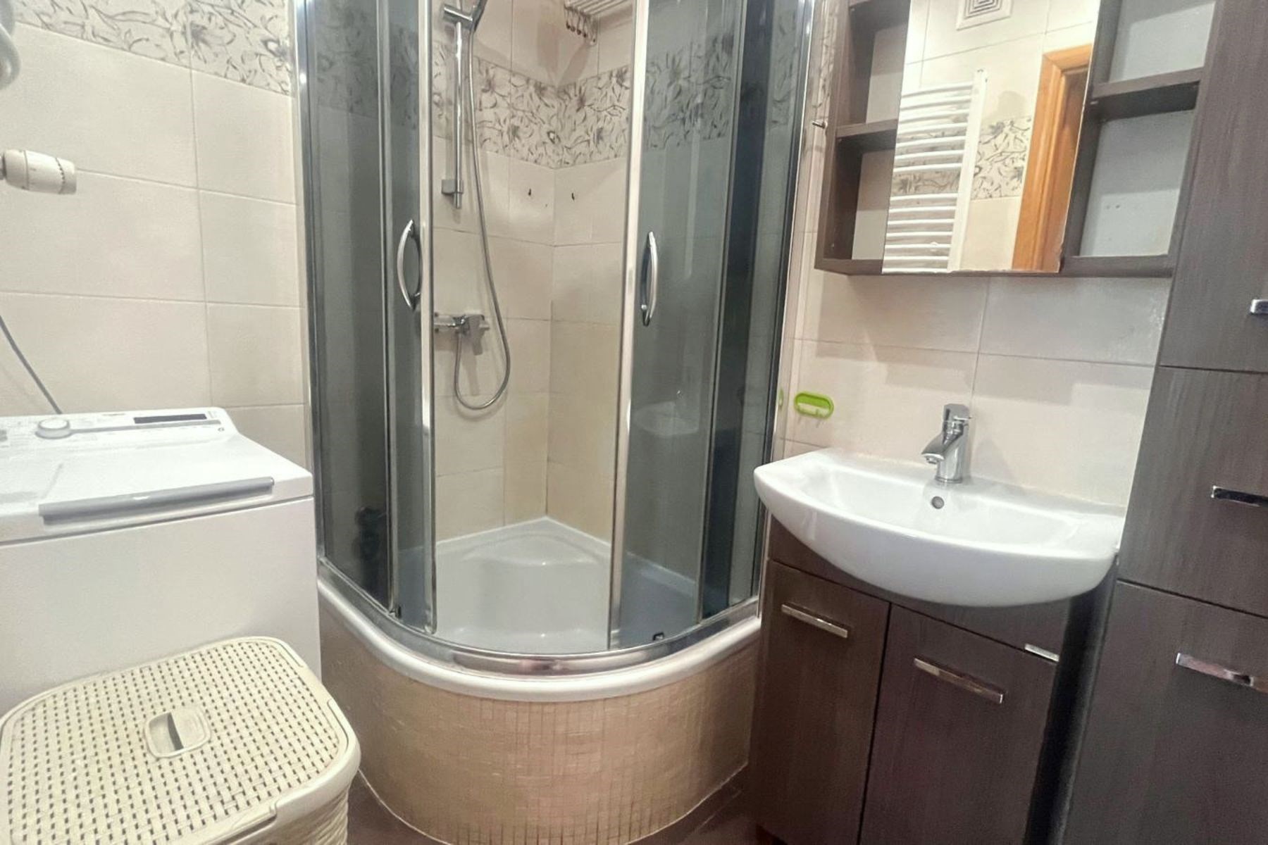 Łazienka: kabina prysznicowa, umywalka i pralka, szafki i kosz na pranie.