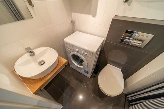 Łazienka: prysznic, szafka, umywalka, WC, pralka.