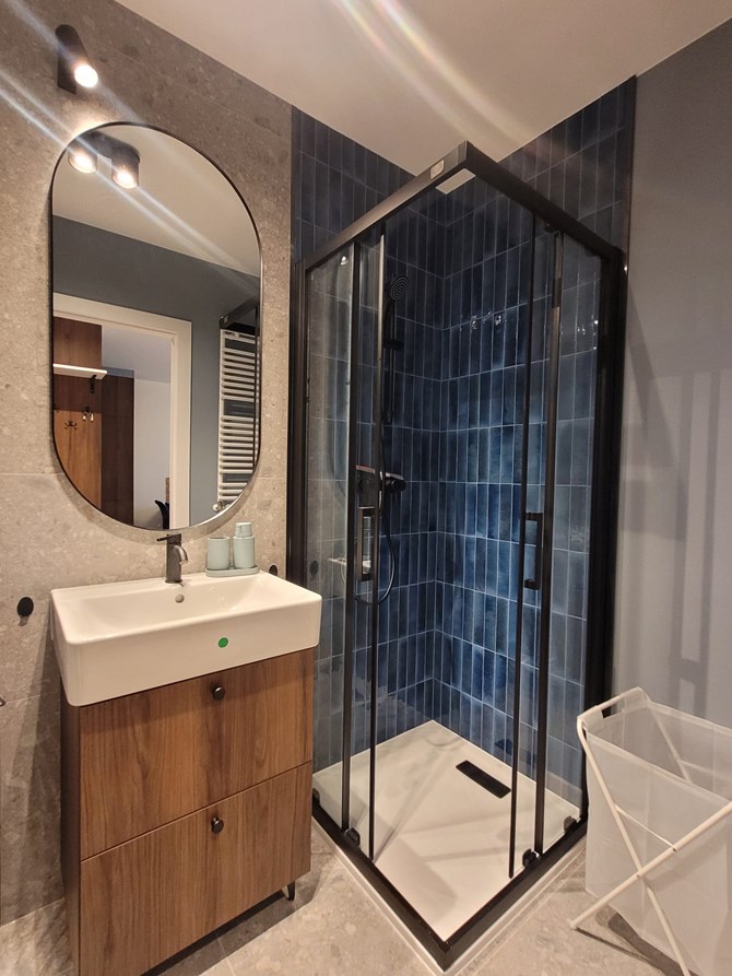 Łazienka: kabina prysznicowa, pralka, szafka, umywalka, lustro.