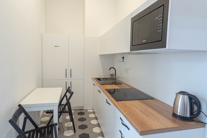 Kuchnia: szafki, lodówka, płyta elektryczna, zlewozmywak, mikrofalówka.
