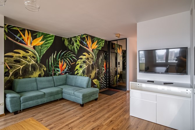 *Salon: rozkładana kanapa narożna, stół, 4 krzesła, wyjście na balkon, komoda, TV (funkcja i okulary 3D).